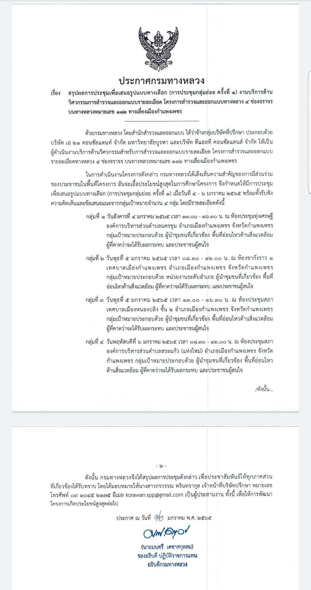 สรุปผลการประชุมเพื่อเสนอรูปแบบทางเลือก (การประชุมกลุ่มย่อยครั้งที่ 1) ระหว่างวันที่ 4-6 มกราคม 2565 โครงการสำรวจและออกแบบทางหลวง 4 ช่องจราจร บนทางหลวงหมายเลข 112 ตอนทางเลี่ยงเมืองกำแพงเพชร