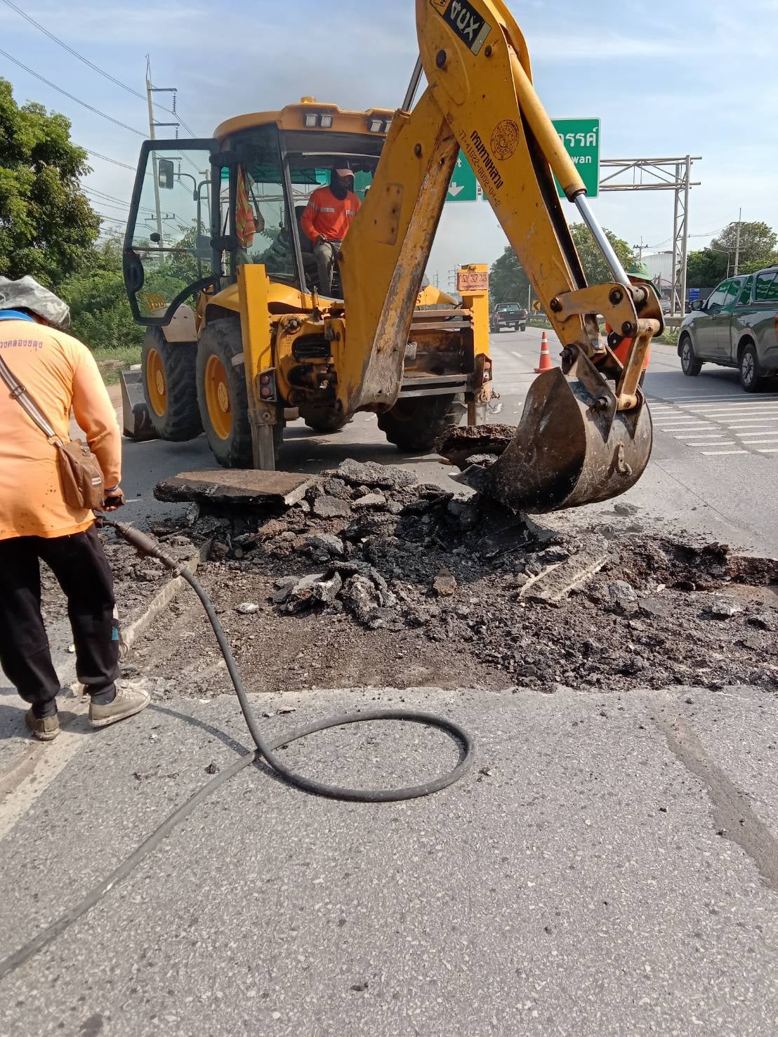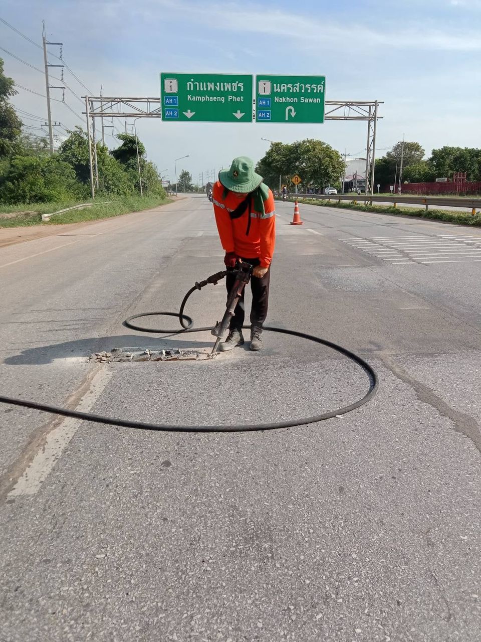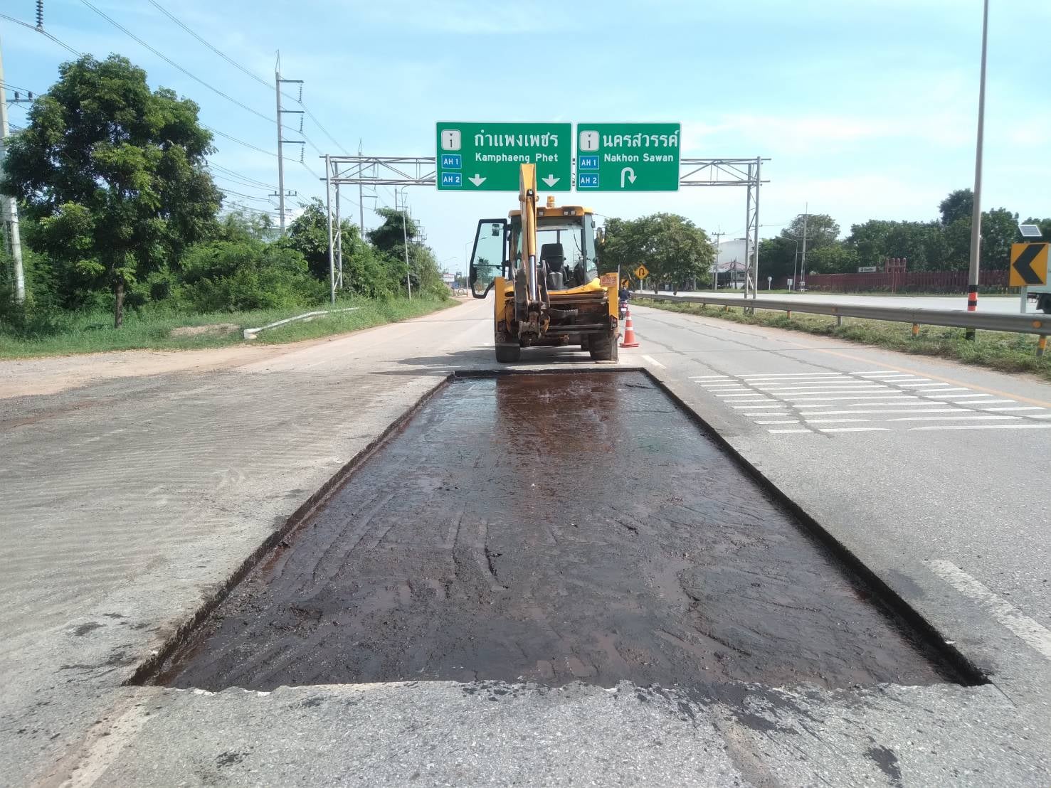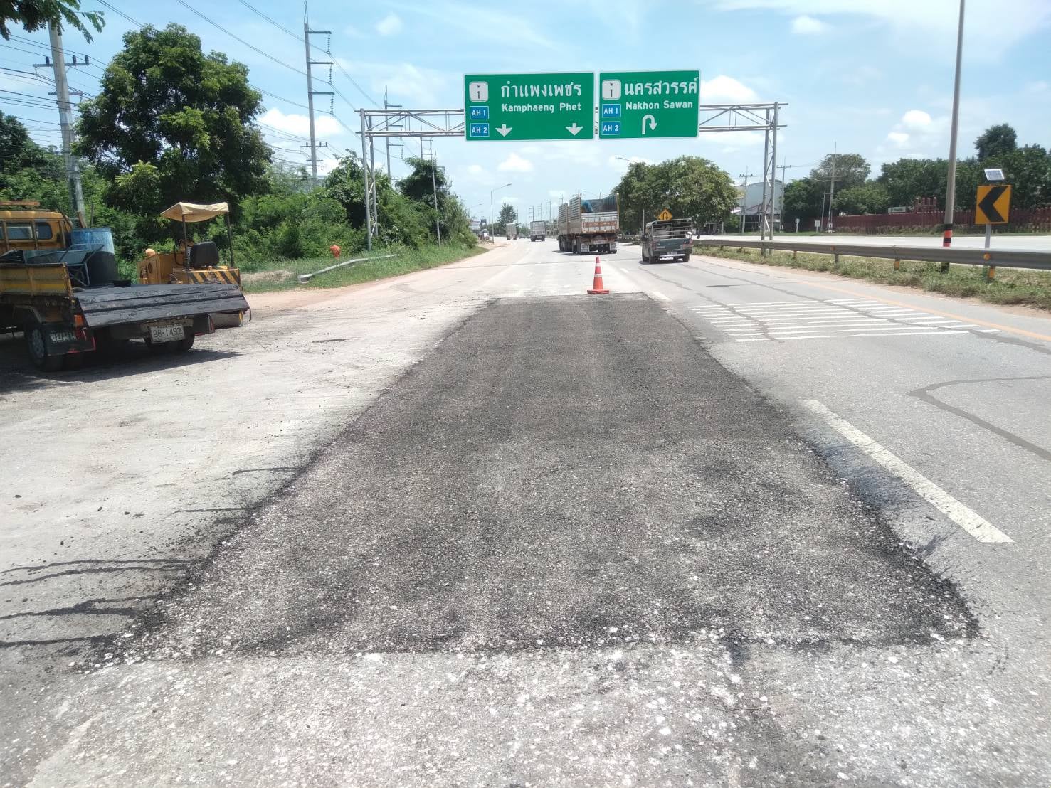 แขวงทางหลวงกำแพงเพชร โดย หมวดทางหลวงคลองขลุง ดำเนินการปะซ่อมผิวทาง ทางหลวงหมายเลข 1 ตอนโนนปอแดง - ปากดง ที่ กม.411+493 เพื่อให้ความสะดวก และปลอดภัยแก่ผู้ใช้เส้นทาง