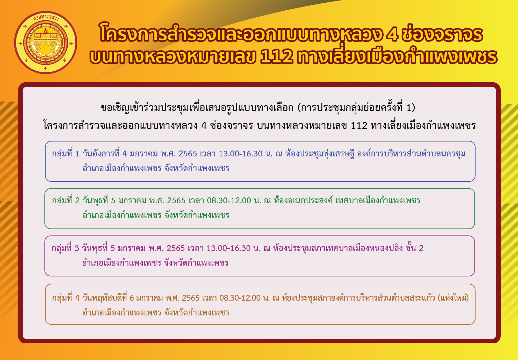 ขอเชิญผู้สนใจเข้าร่วมประชุมเพื่อเสนอรูปแบบทางเลือก (การประชุมกลุ่มย่อยครั้งที่ 1) โครงการสำรวจและออกแบบทางหลวง 4 ช่องจราจร บนทางหลวงหมายเลข 112 ทางเลี่ยงเมืองกำแพงเพชร