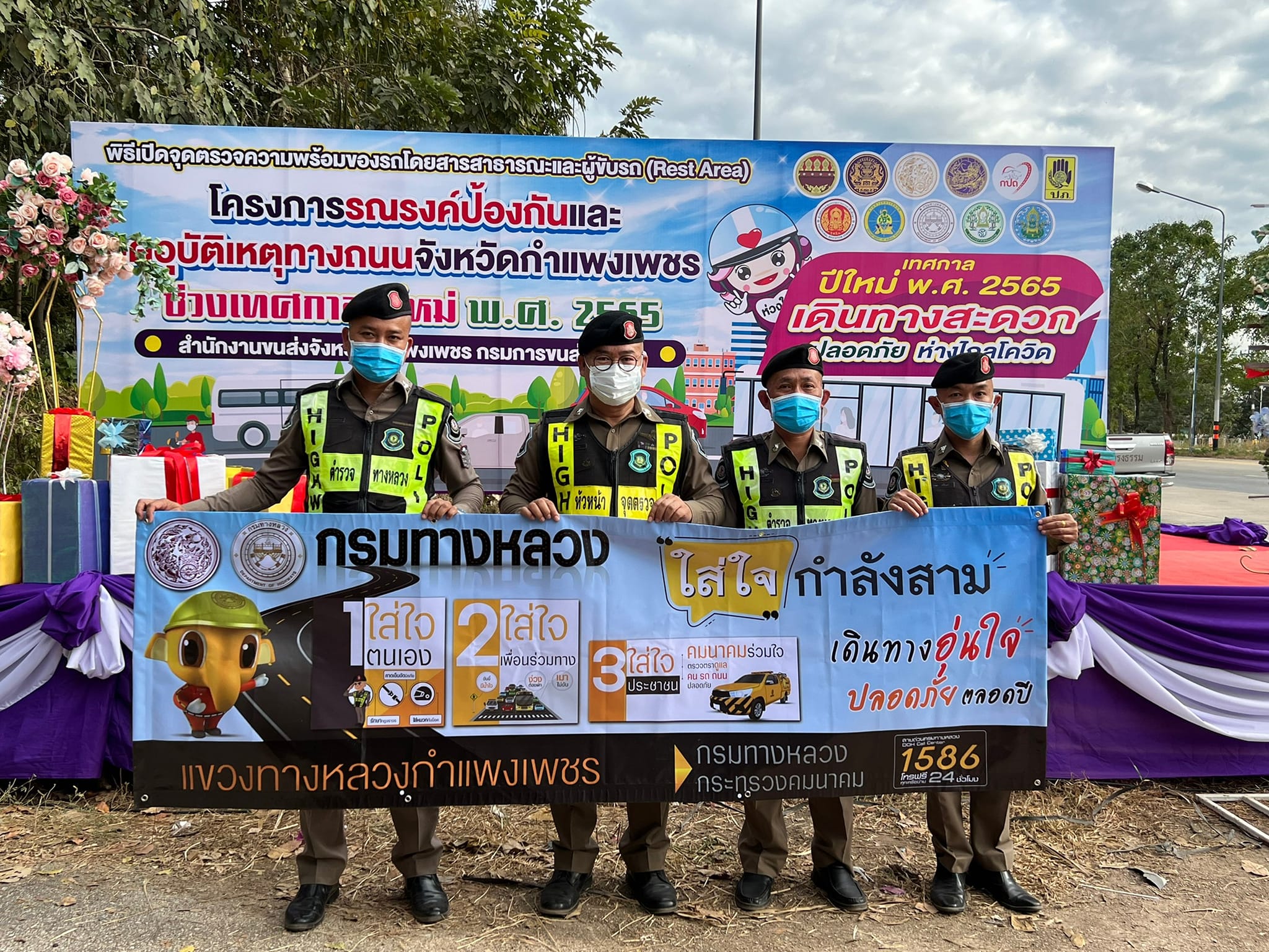 วันพุธ ที่ 29 ธันวาคม 2564 เวลา 14.30 น. นายชัยศิริ ผูกใจเพื่อน ผอ.ขท.กำแพงเพชร มอบหมายให้นางณิชาดา รอดพินิจ หัวหน้าหมวดทางหลวงโกสัมพีนคร, นางสุดารัตน์ เสมาฉิม หัวหน้างานสารสนเทศ พร้อมคณะแขวงทางหลวงกำแพงเพชร เข้าร่วมพิธีเปิดจุดตรวจความพร้อมของรถโดยสารสารธารณะและผู้ขับรถและให้บริการประชาชน เทศกาลปีใหม่ 2565 บริเวณทางหลวงหมายเลข 1 ตอน นครชุม-วังเจ้า กม.465+656 ด้านขวาทาง โดยนางสาวสุพัตรา คล้ายทิม รองผู้ว่าราชการจังหวัดกำแพงเพชร เป็นปนะธานในพิธี