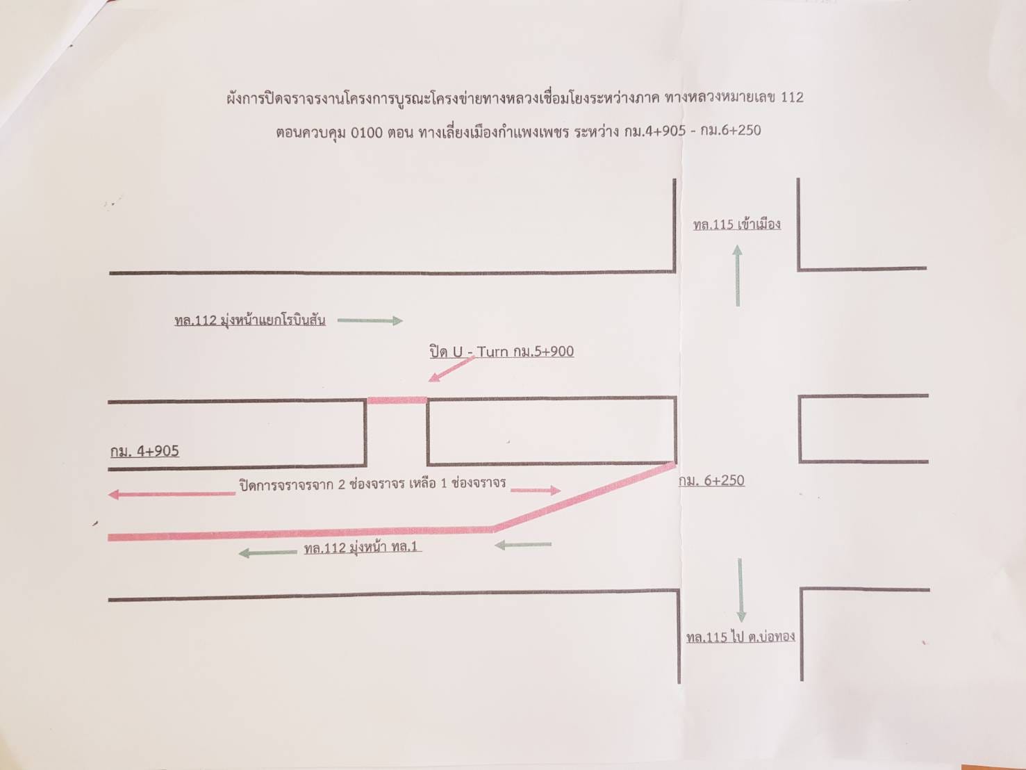 ด้วยแขวงทางหลวงกำแพงเพชร อยู่ระหว่างดำเนินงานโครงการบูรณะโครงข่ายทางหลวงเชื่อมโยงระหว่างภาค ทางหลวงหมายเลข 112 ตอนทางเลี่ยงเมืองกำแพงเพชร ระหว่าง กม.4+905-กม.6+250 ด้านซ้ายทาง ซึ่งในการก่อสร้างมีความจำเป็นต้องปิดจุดกลับรถ ที่ กม.5+950 (ก่อนถึงสี่แยกไฟแดงป้อมตำรวจจราจร) และปิดช่องจราจรในพื้นที่ก่อสร้าง (บริเวณสี่แยกไฟแดง) จากสองช่องจราจรเหลือหนึ่งช่องจราจร ตั้งแต่ กม.4+950-กม.6+250 ด้านซ้ายทาง จนกว่าจะดำเนินการแล้วเสร็จ จึงขออภัยในความไม่สะดวกในการใช้เส้นทางช่วงบริเวณดังกล่าว และโปรดปฏิบัติตามป้ายจราจร ทั้งนี้ การปิดช่องจราจรดังกล่าวจะเร่งเปิดใช้ก่อนเทศกาลสงกรานต์