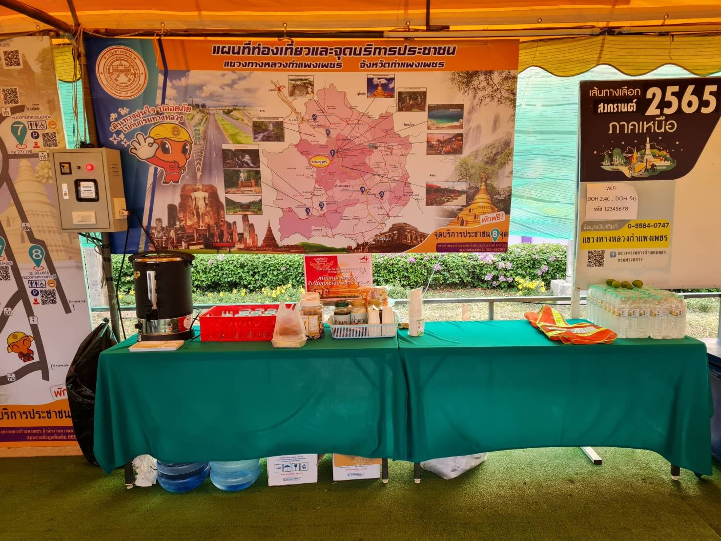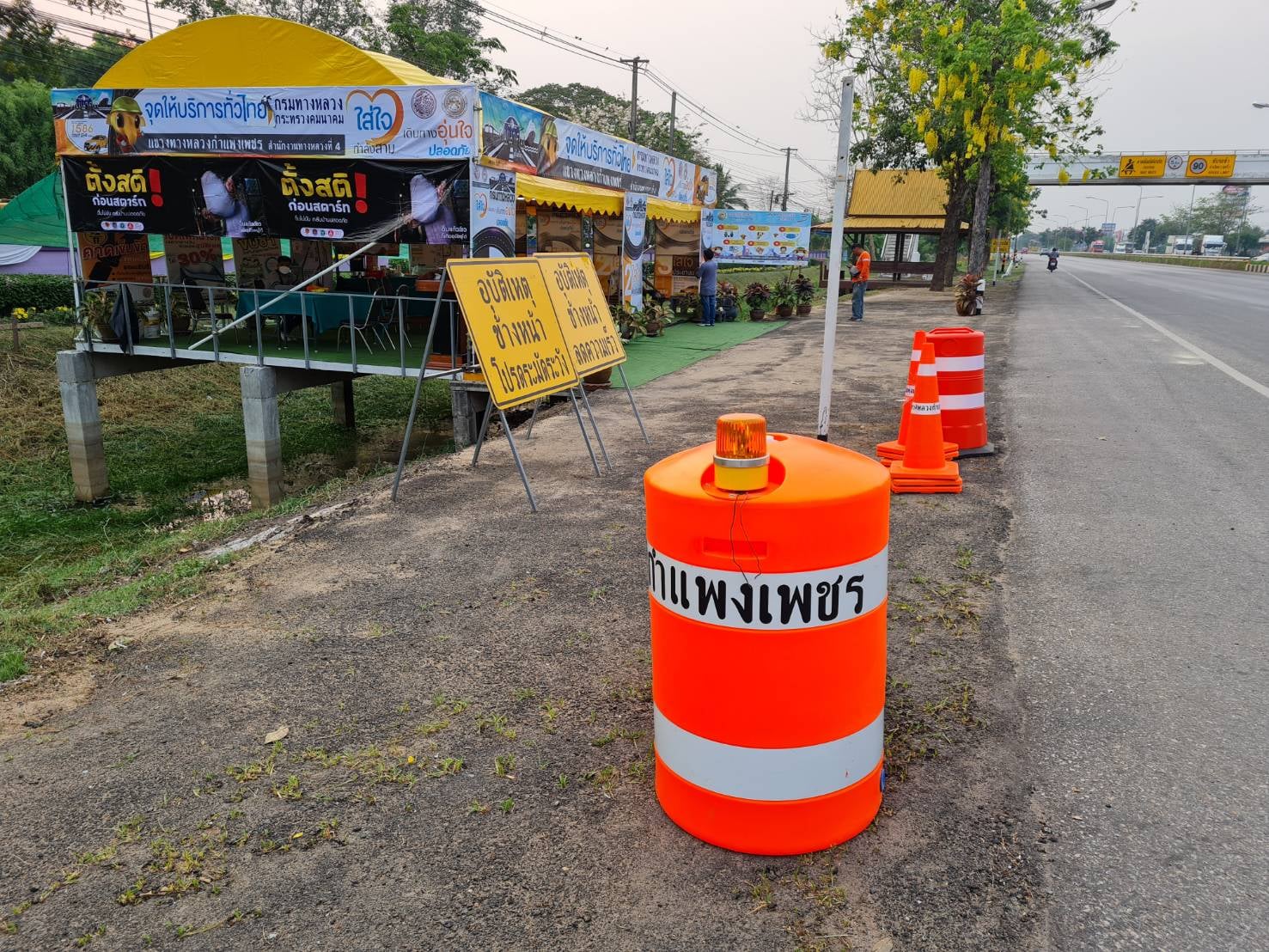แขวงทางหลวงกำแพงเพชร เตรียมพร้อมจุดบริการประชาชน เต็นท์หน้าแขวงทางหลวงกำแพงเพชร ทางหลวงหมายเลข 1 ตอนปากดง-นครชุม ที่ กม.453+076 ด้านซ้ายทาง
