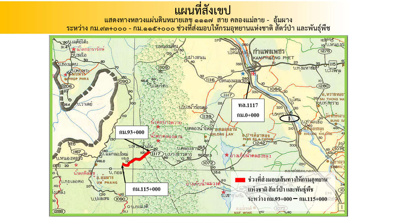 นายชัยศิริ ผูกใจเพื่อน ผู้อำนวยการแขวงทางหลวงกำแพงเพชร เป็นผู้แทนกรมทางหลวง พร้อมด้วยนายฐมศิลป์ ตันศรีตรัง รักษาการในตำแหน่ง วิศวกรโยธาชำนาญการพิเศษ สำนักแผนงาน, นายเดชา กุลกิจโรภาส รองผู้อำนวยการแขวงทางหลวงกำแพงเพชร ฝ่ายปฏิบัติการ, หัวหน้าหมวดทางหลวง และเจ้าหน้าที่ในสังกัด ร่วมพิธีลงนามการส่งมอบ-รับมอบพื้นที่ให้กรมอุทยานแห่งชาติสัตว์ป่า และพันธ์ุพืช ทางหลวงหมายเลข 1117 ตอนคลองแม่ลาย - อุ้มผาง ระหว่าง กม.93+000-กม.115+000 โดยนายปรยุษณ์ ว่องไว ผู้อำนวยสำนักบริหารพื้นที่อนุรักษ์ที่14 เป็นผู้แทนกรมอุทยานแห่งชาติ สัตว์ป่า และพันธ์พืช พร้อมด้วยนายบุญช่วย ชุนหกิจ ผู้อำนวยการส่วนอนุรักษ์สัตว์ป่า และนายอำนาจ ฟองชัย หัวหน้าเขตรักษาพันธุ์สัตว์ป่าอุ้มผาง ร่วมลงนามในบันทึกฯ ณ ห้องประชุมแขวงทางหลวงกำแพงเพชร