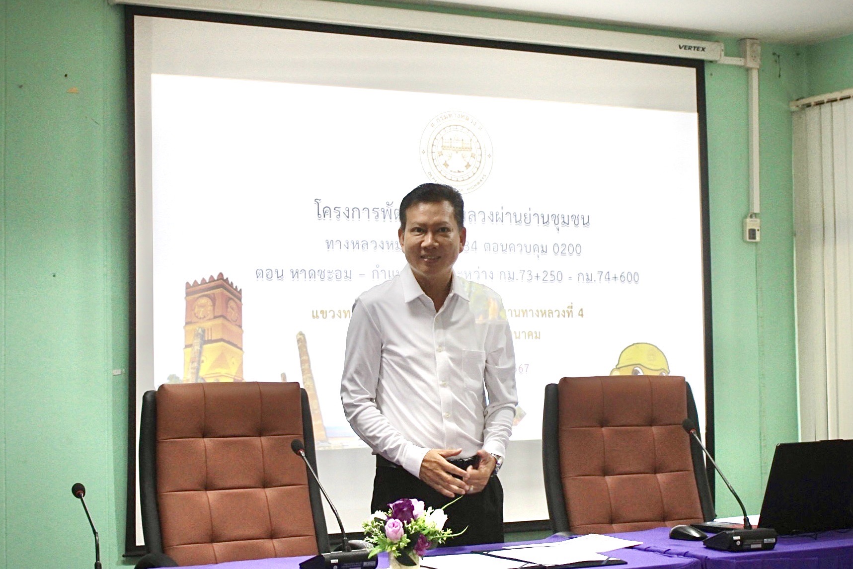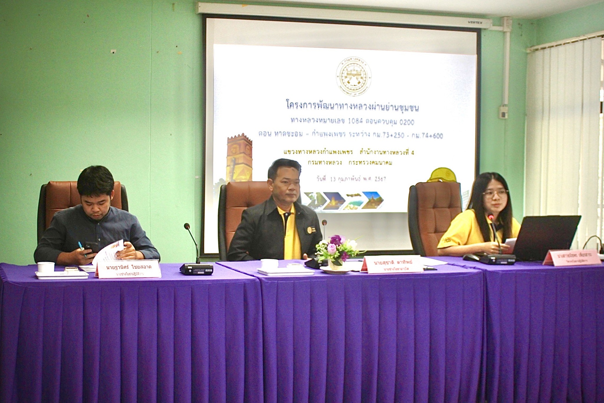 นายชัยศิริ ผูกใจเพื่อน ผู้อำนวยการแขวงทางหลวงกำแพงเพชร มอบหมายให้ นายสุชาติ ตาทิพย์ รองผู้อำนวยการ ฝ่ายวิศวกรรม นำคณะเจ้าหน้าที่ในสังกัด จัดประชุมการมีส่วนร่วมของประชาชน เพื่อปรับปรุงขยายผิวทางจราจรจาก 2 ช่อง เป็น 4 ช่องจราจร กิจกรรมก่อสร้างทางหลวงพัฒนาพื้นที่ระดับภาค งานก่อสร้างเพิ่มช่องจราจรระดับภาค ทางหลวงหมายเลข 1084 ตอน หาดชะอม – กำแพงเพชร ระหว่าง กม.73+259 – กม.74+600 ท้องที่ ต.วังยาง อ.คลองขลุง จ.กำแพงเพชร ณ ห้องประชุมสำนักงานเทศบาลตำบลวังยาง ในการนี้ นายสดุดี พุทธัง นายอำเภอคลองขลุง ให้เกียรติเป็นประธานในพิธีเปิดการประชุม ซึ่งในที่ประชุม มีมมติเห็นด้วยในการให้ดำเนินโครงการ
