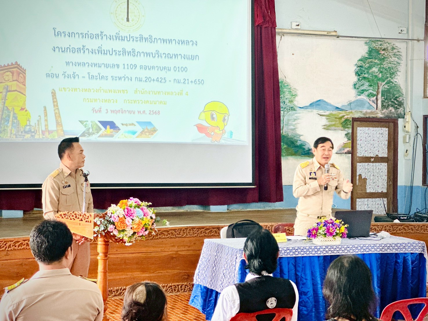 นายชัยศิริ ผูกใจเพื่อน ผู้อำนวยการแขวงทางหลวงกำแพงเพชร พร้อมด้วยนายสุชาติ ตาทิพย์ รองผู้อำนวยการฝ่ายวิศวกรรม และหัวหน้าหมวดทางหลวงโกสัมพีนคร นำคณะเจ้าหน้าที่ในสังกัด จัดประชุมการมีส่วนร่วมของประชาชน โครงการพัฒนาทางหลวงเพื่อสนับสนุนระบบคมนาคมและโลจิสติกส์ งานก่อสร้างเพิ่มประสิทธิภาพทางหลวง บริเวณทางหลวงหมายเลข 1109 ตอนควบคุม 0100 ตอนวังเจ้า - โละโคะ ระหว่าง กม.20+425 - กม.21+650 รวมระยะทาง 1.225 กิโลเมตร ในพื้นที่ตำบลโกสัมพี อำเภอโกสัมพีนคร จังหวัดกำแพงเพชร โดยก่อสร้างปรับปรุงเพิ่มประสิทธิภาพทางแยกงานก่อสร้างระบบระบายน้ำ งานติดตั้งไฟฟ้าแสงสว่าง และอุปกรณ์อำนวยความปลอดภัยต่างๆ เพื่ออำนวยความสะดวกปลอดภัยแก่ผู้ใช้เส้นทาง พร้อมทั้งรองรับปริมาณจราจรที่เพิ่มขึ้นในอนาคต ณ โรงเรียนบ้านหนองแดน ตำบลโกสัมพี อำเภอโกสัมพีนคร จังหวัดกำแพงเพชร ในการนี้นายสกุลเพชร พิกุลประเสริฐ หัวหน้าสำนักงานจังหวัดกำแพงเพชร ให้เกียรติเป็นประธานในพิธีเปิดการประชุม ซึ่งในที่ประชุมมีมติเห็นด้วยในการให้ดำเนินโครงการ