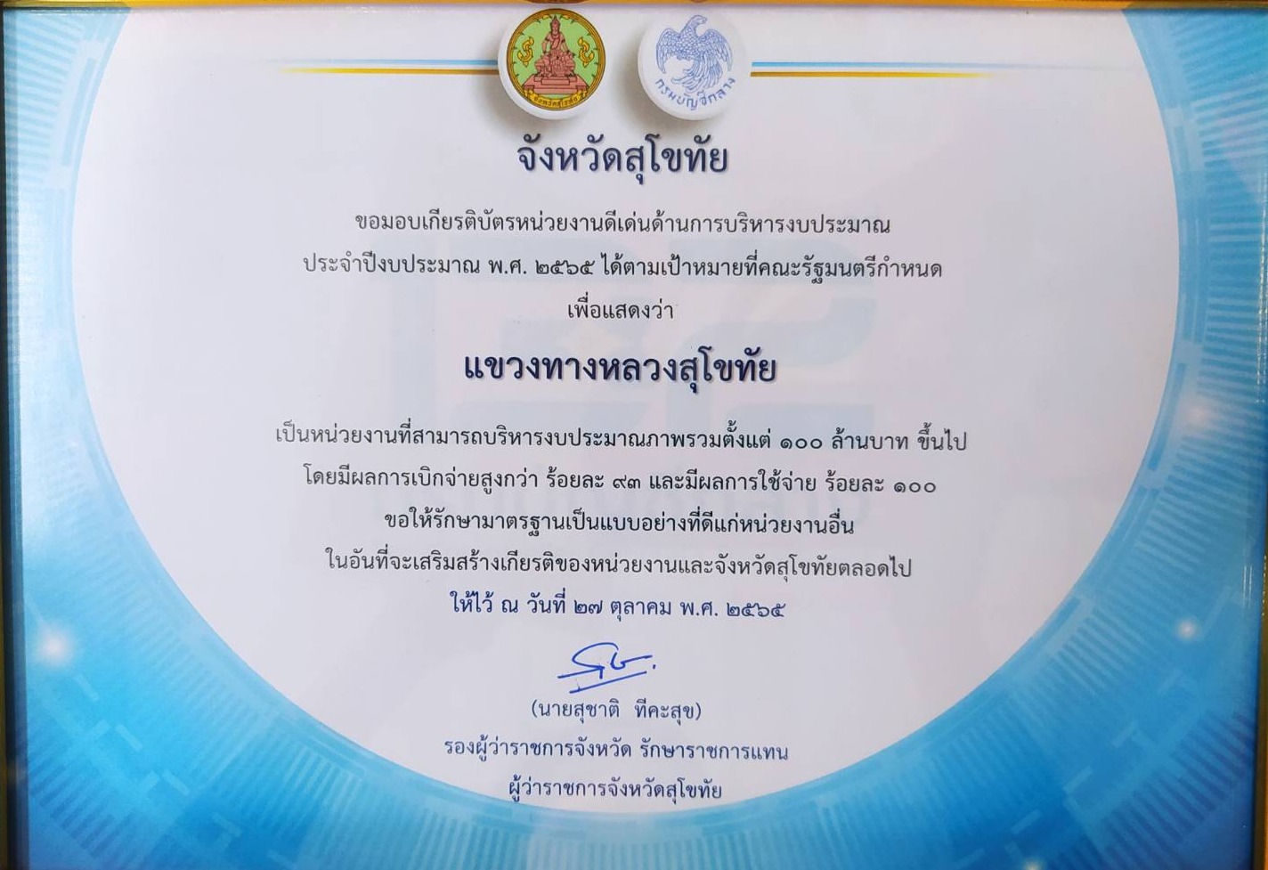 ข้อมูลข่าว : แขวงทางหลวงสุโขทัย ได้รับรางวัลหน่วยงานดีเด่นด้านการบริหารงบประมาณ ประจำปีงบประมาณ พ.ศ.2565