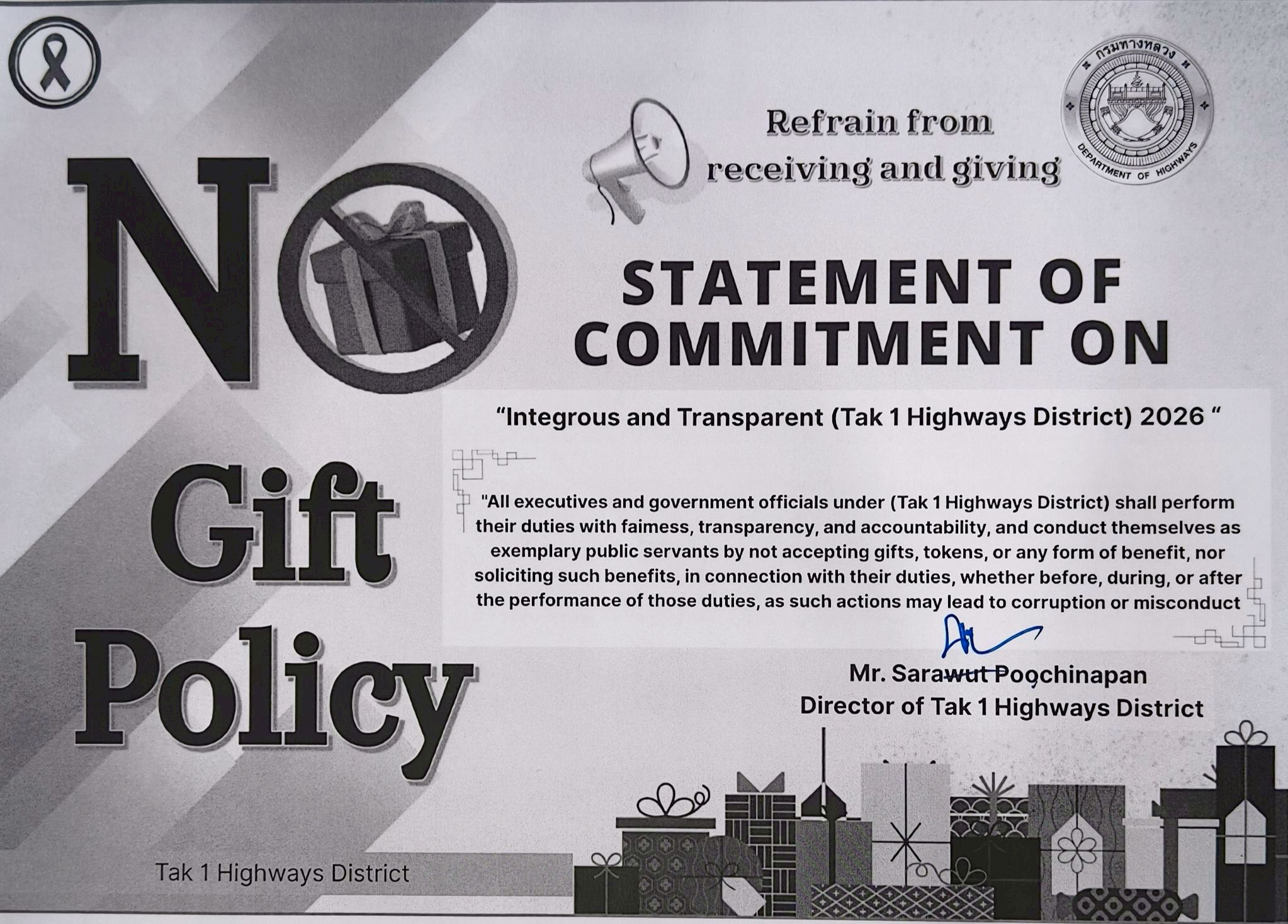 ประกาศเจตนารมณ์ สุจริตโปร่งใส่ แขวงทางหลวงตากที่ 1 ใสสะอาด 2569