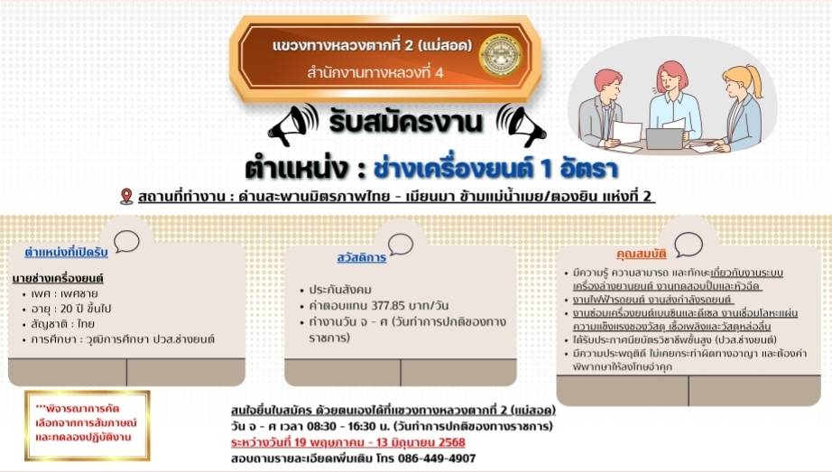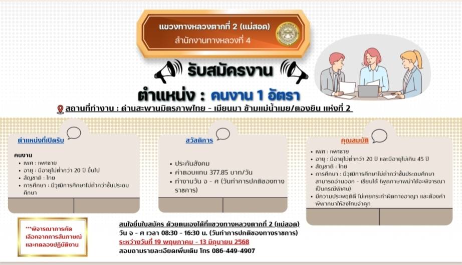 เปิดรับสมัครบุคลากรเข้าทำงาน ณ ด่านสะพานมิตรภาพไทย - เมียนมา ข้ามแม่น้ำเมย/ตองยิน แห่งที่ 2 จำนวน 3 อัตรา