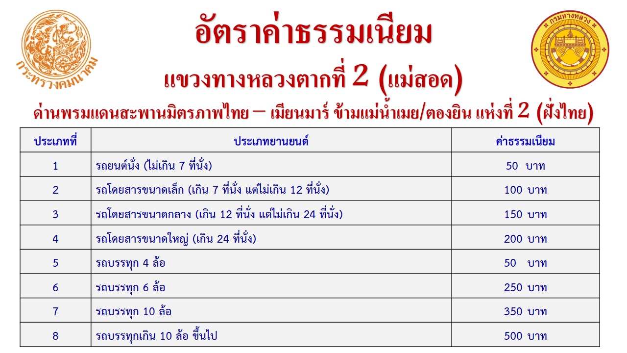 กระทรวงคมนาคม กรมทางหลวง โดยแขวงทางหลวงตากที่ 2 (แม่สอด) ด่านพรมแดนสะพานมิตรภาพไทย – เมียนมาร์ ข้ามแม่น้ำเมย/ตองยิน แห่งที่ 2 (ฝั่งไทย)