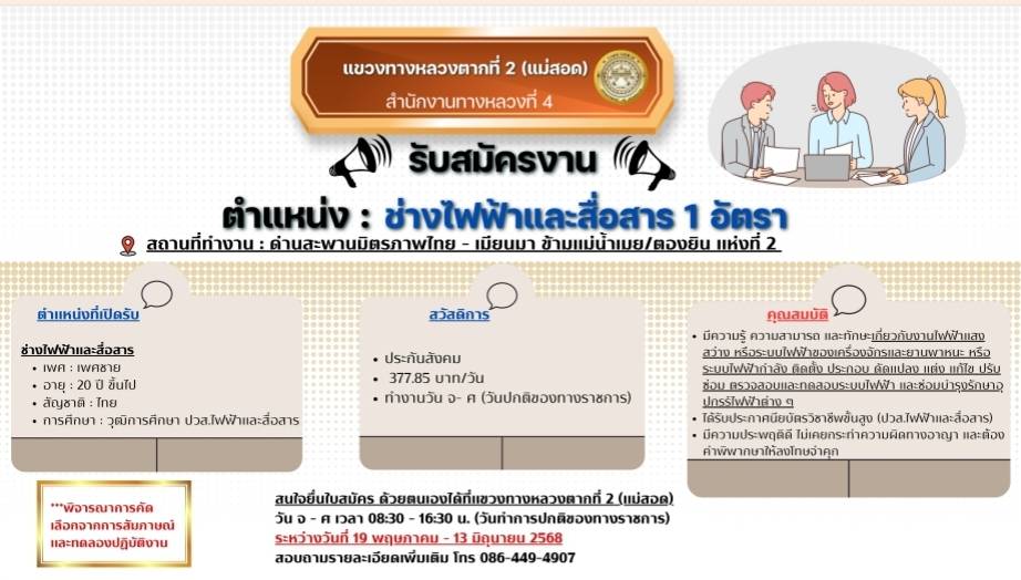สนใจยื่นใบสมัครด้วยตนเองได้ที่แขวงทางหลวงตากที่ 2 (แม่สอด)